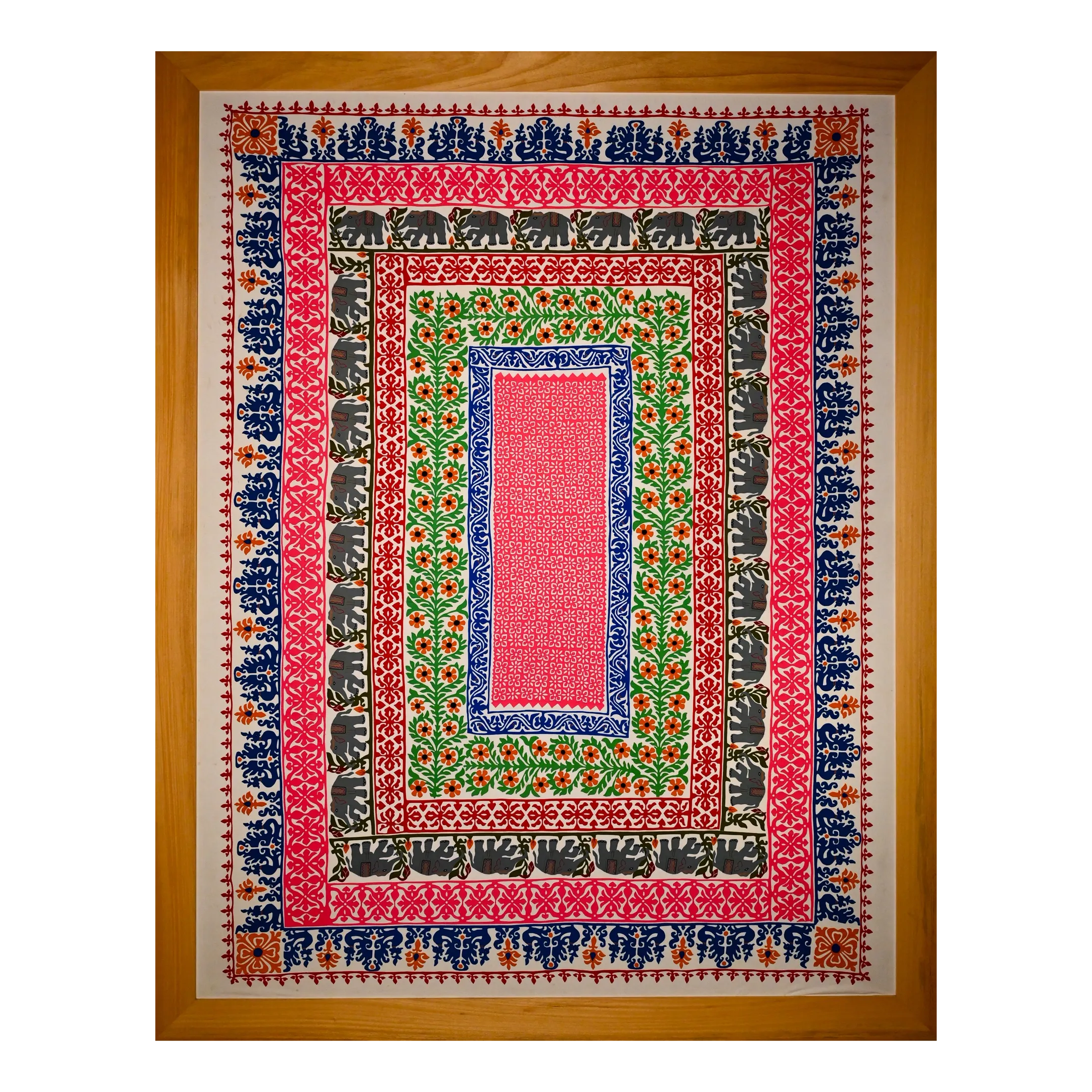 The featured artwork draws on Hindu spiritual symbols, specifically elephants and peacocks, which represent divinity. These are depicted alongside intricate floral motifs. Using a bold palette of red, yellow, green, and blue, the piece is noted for its "magnetic charm." The intricate craftsmanship and bright, contrasting fabric patches create a striking three-dimensional effect that defines the textile traditions of Bihar.