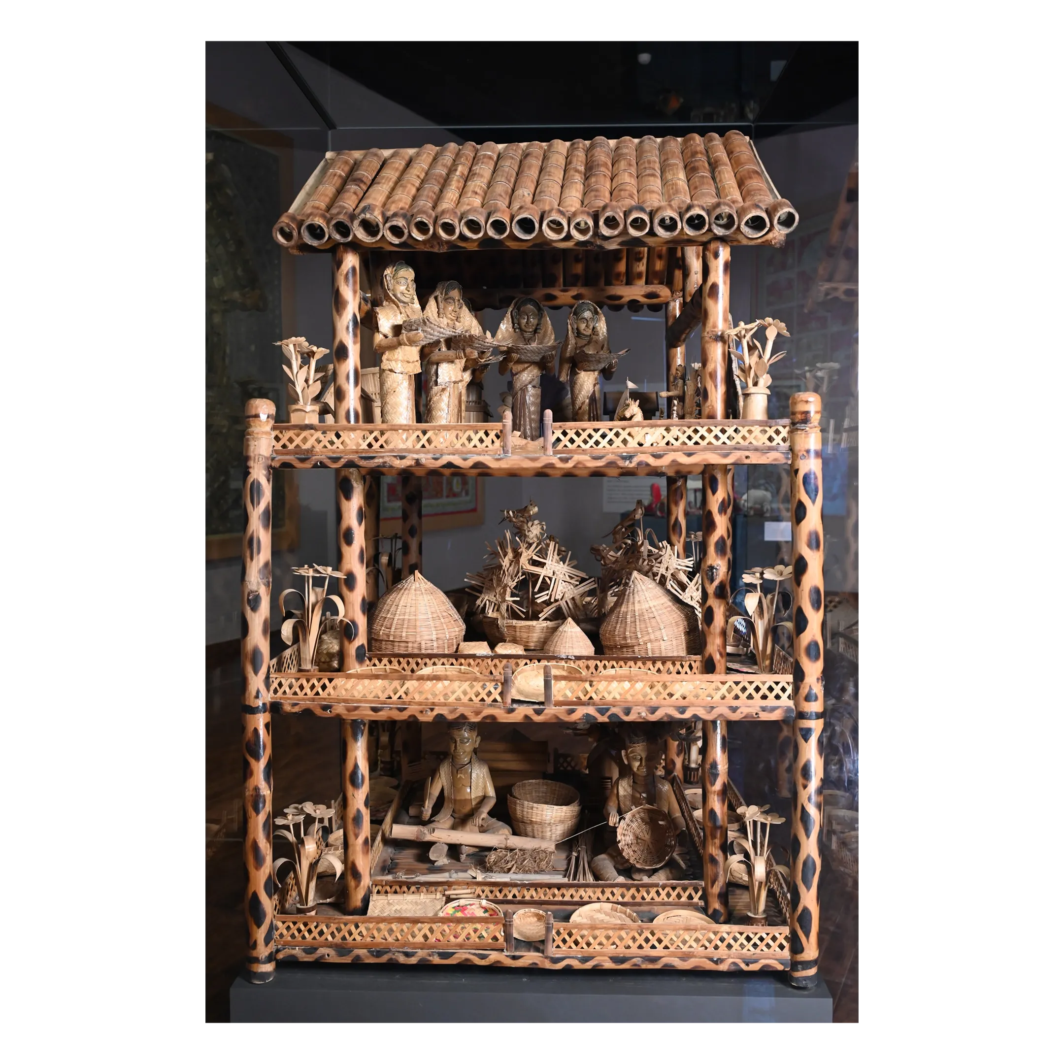 Chhath is a nature-centric festival dedicated to the rising and setting sun. It is celebrated for progeny, health, and communal harmony, emphasizing environmental consciousness through its use of natural offerings. Rooted in Vedic and mythological texts, the festival occurs twice annually (Chaitra and Kartik), with the Kartik celebration being the most prominent globally. Mallik uses bamboo to create a three-tiered narrative structures. The Ground Floor depicts the crafting process, featuring sculptures of artisans making traditional bamboo soops, dauras (baskets), and containers; the First Floor displays the ritual materials essential to the festival, including sugarcane stalks, coconuts, traditional clay stoves (chulhas), and bamboo dalias and the Top Floor portrays the spiritual climax, showing female devotees offering arghya (oblations) to the Sun God using bamboo soops filled with traditional prasad like thekua, bananas, and radish. The work serves as a powerful narrative of devotion and craftsmanship, demonstrating how traditional bamboo art remains inextricably linked to Bihar’s cultural identity and religious rituals.