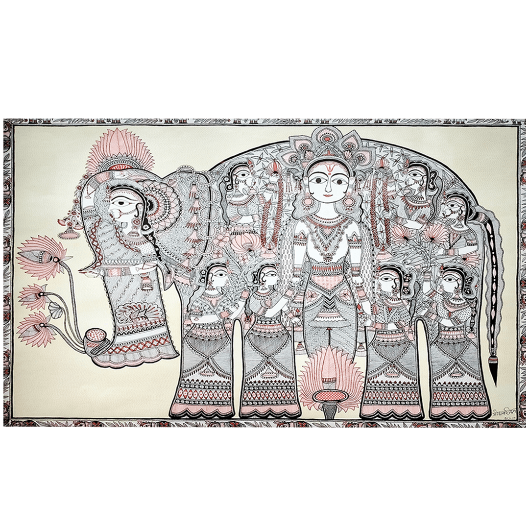 The painting captures the moment Gajendra (the elephant king and Vishnu devotee) is seized by a crocodile. After his own efforts fail, Gajendra offers a lotus flower to Lord Vishnu, who appears and kills the crocodile with his Sudarshan Chakra to liberate his devotee. The work is uniquely rendered using only black and red on a white background, demonstrating the power of line-based storytelling. In a distinctive stylistic choice, Godavari Dutt depicts Vishnu and other deities across the entire body of the elephant. Vishnu’s face is portrayed with deep compassion, flanked by goddesses who cheer his arrival. The piece is noted for its linear rhythm, precise proportions, and balanced perspective. The lotus flower held in Gajendra’s trunk serves as a poignant focal point, symbolizing the act of complete surrender and faith.