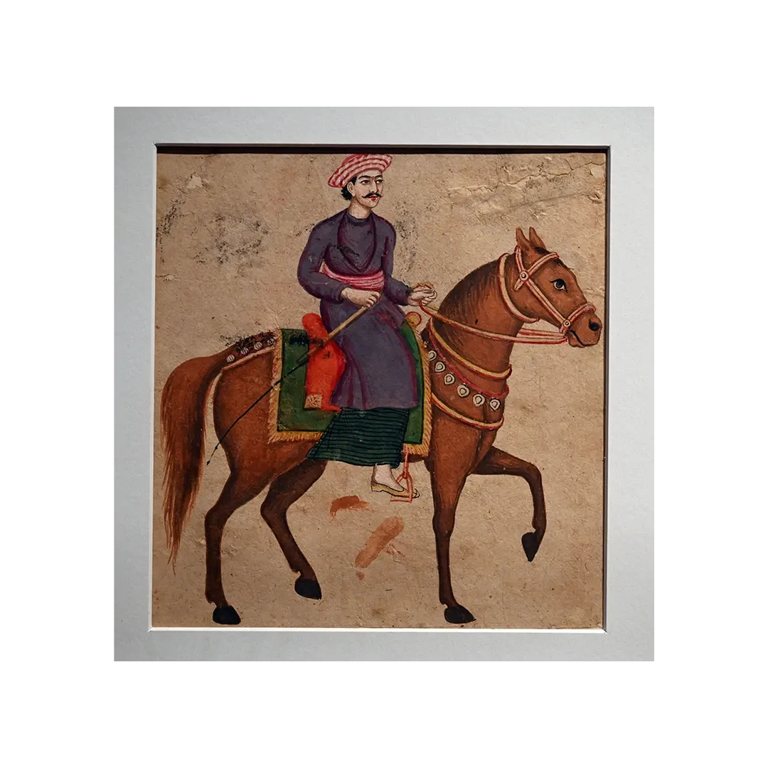 This captivating painting on paper depicts a rider on horseback in motion, exuding grace and strength. Dressed in traditional attire, the rider holds the reins in his left hand, while his right hand rests on a sword tucked into his waistband. The horse, with one leg raised, is depicted in a walking stance, capturing fluidity and movement. The absence of a background focuses attention entirely on the rider and horse, emphasizing their harmony. This artwork showcases the artist’s keen attention to detail and offers a glimpse into historical equestrian traditions, highlighting the courage and elegance of the rider.