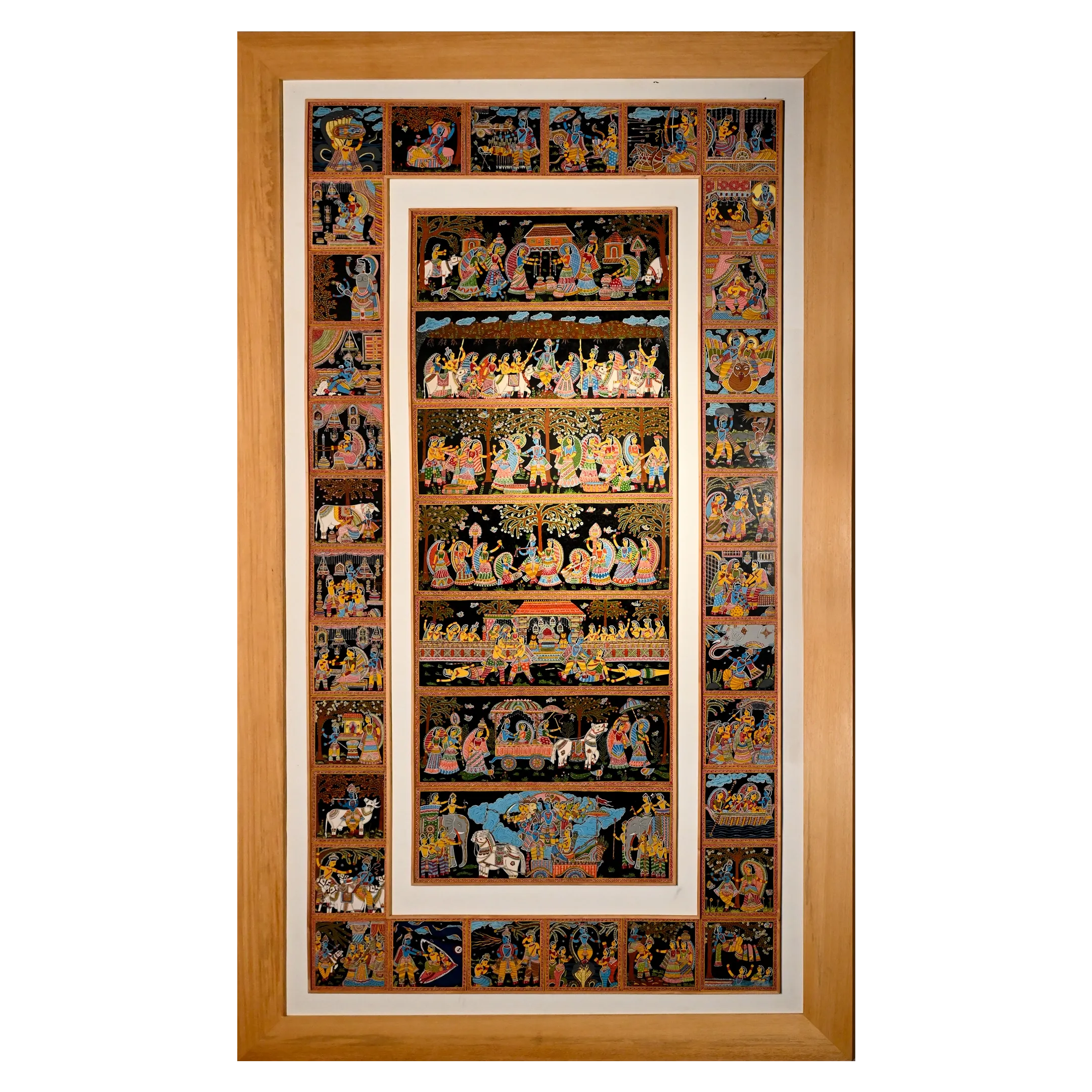 This Tikuli painting by Padma Shri awardee Ashok Kumar Biswas beautifully captures the entirety of Krishna's life. The artwork illustrates key moments from his birth to his final departure, including his childhood pranks, his role as a protector of cows, the Makhan Chor (butter thief) phase, the defeat of Kaliya Naag, the teachings of the Bhagavad Gita. Draupadi's disrobing incident, Krishna lifting Govardhan mountain, the Jarasandha yudh. his divine incarnation, his role as a flute-playing lover and his presence on the battlefield during Jayadratha Vadh.