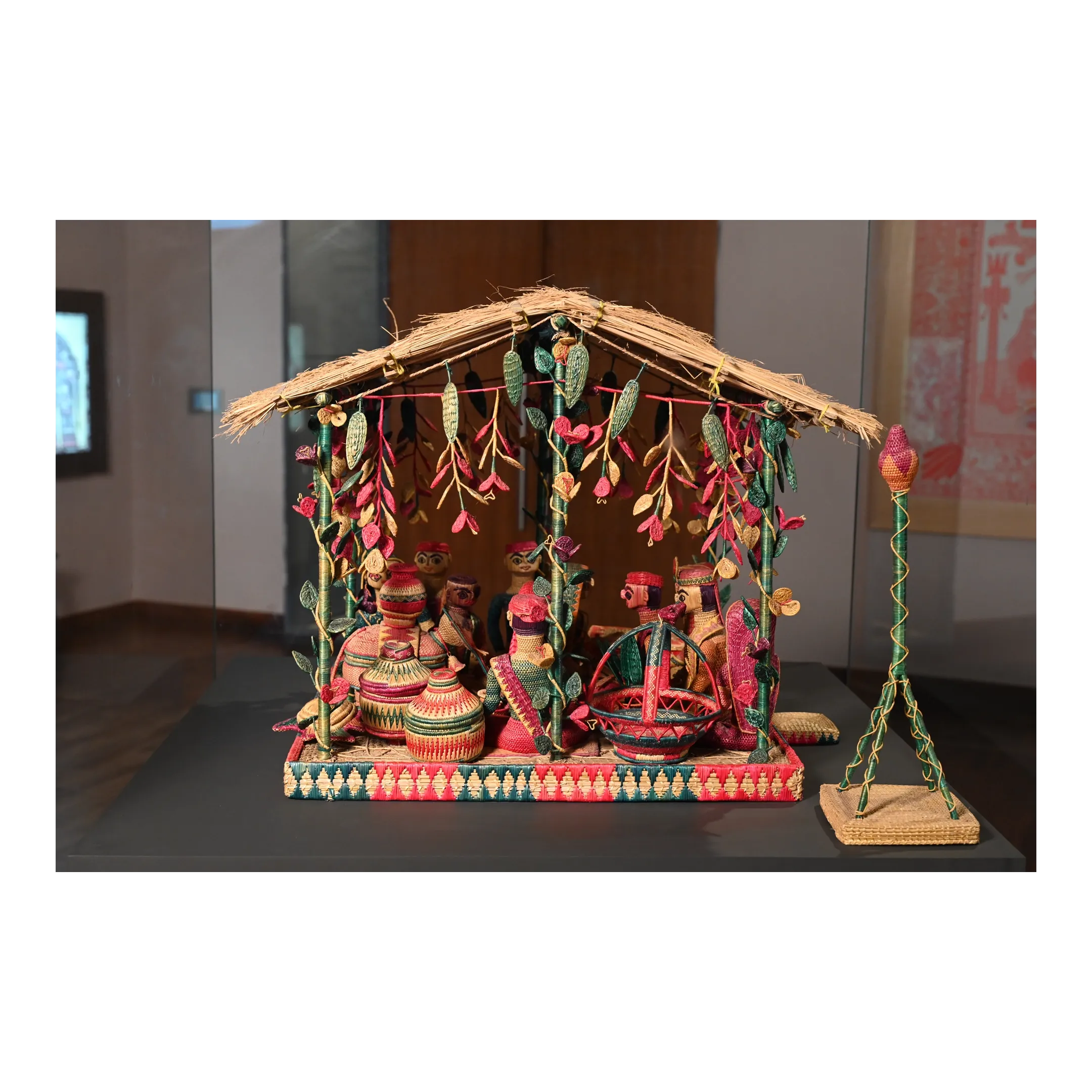 This description highlights the unique Sikki grass craft of Bihar, specifically a wedding-themed installation by State Award-winning artist Munni Devi.