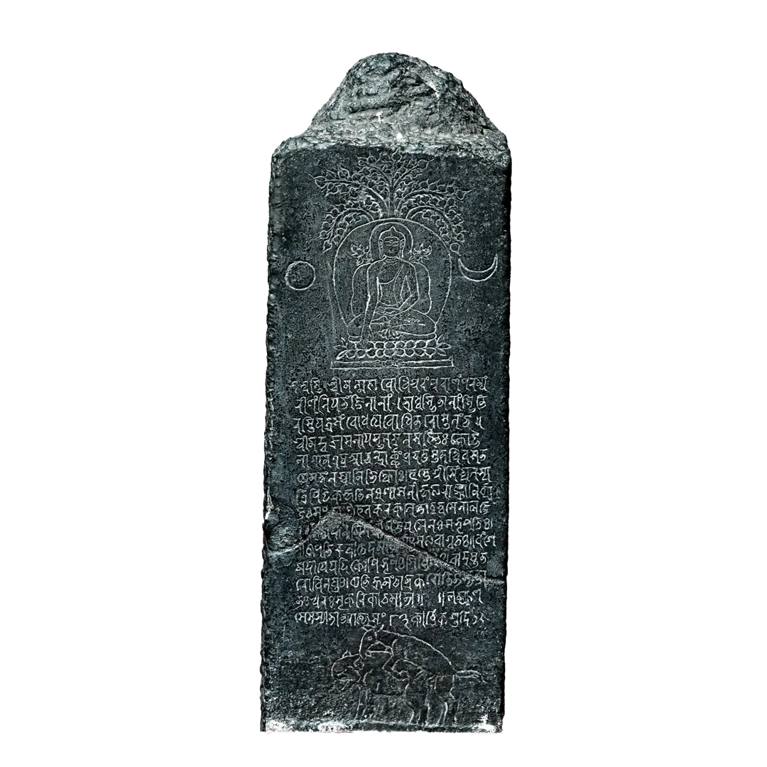 This boundary pillar edict of the 12th c. AD is made of black stone and obtained from Jani Bigha of Bodhgaya, Gaya. Buddha is engraved in Bhumisparsha Mudra under the Peepal tree on the top of the pillar edict. Additionally, there is a depiction of the Sun on the right side and the moon on the left side, and on the downside, there is an inscription consisting of 14 lines of Nagari script. The language of the pillar edict is Sanskrit, and the letters are of the Nagari script from Eastern India, from where both Maithili and Nagari has been originated. The inscription records the grant of a village named Kotthala in the district of Saptaghatta for the maintenance of the Diamond Throne and monastery attached to the Ceylonese monk Mangalasvamin by the king Jayasena, the son of Buddhasena, the lord of Pithi (pithi-pati.) There is also a description of a dwarf & an ass at the bottom. The animal groups below are all incised. The inscription engraved on the boundary pillar is of the 83rd year of the Lakshmanasena era.
