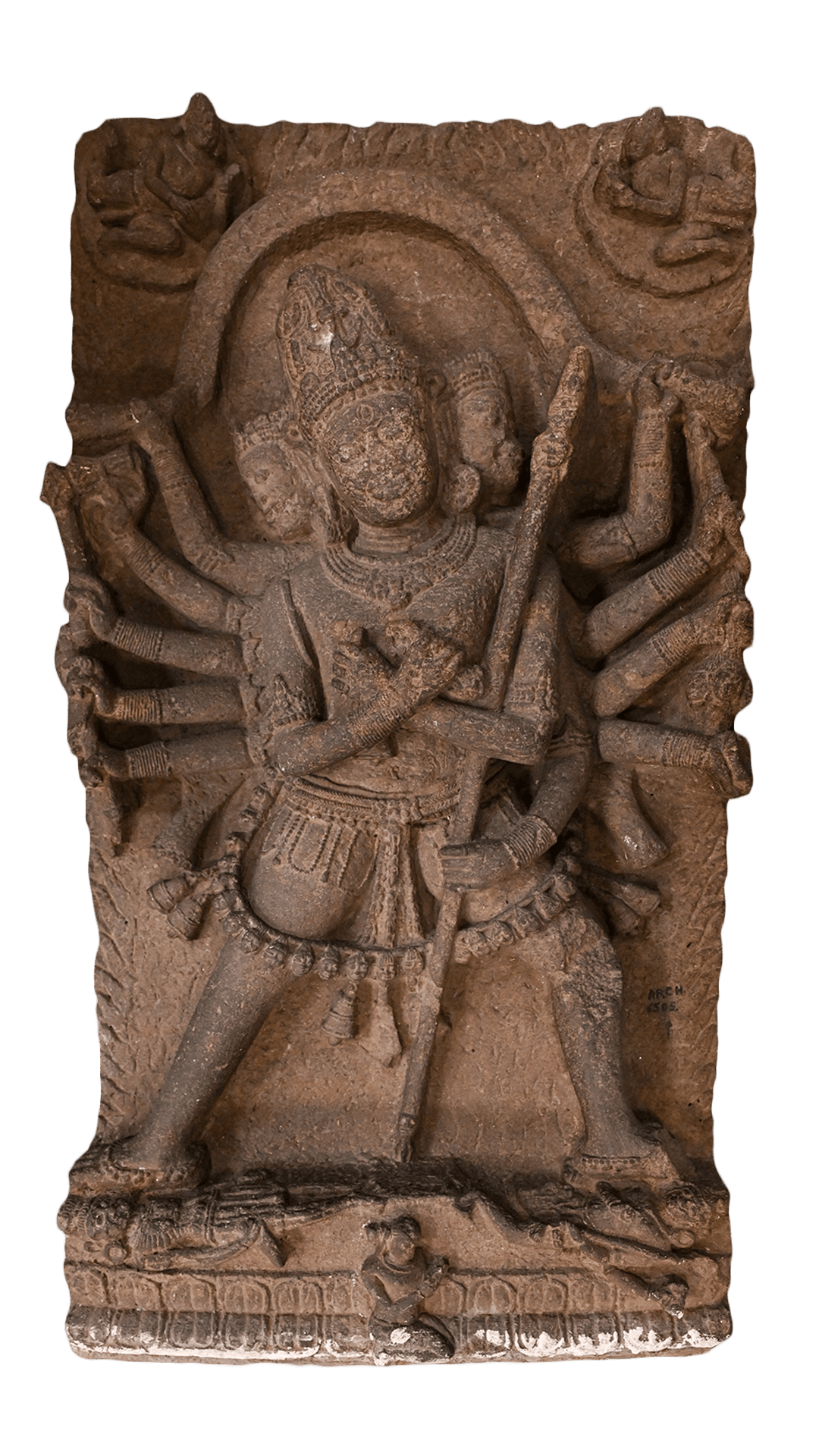 Twelve-armed and three-faced Sambara standing on double lotus seat (mahambujapitha) in alidha pose and vajra humkara posture. The middle face has jatamukuta with crescent. He is wearing long garlands of skulls; the right leg is placed on an emaciated female holding a sword(Bhairavi), and the left is on a small body also lying on his back with four arms. The lower left staff is broken; one right hand is in front of the chest, and the remaining is broken; the main divinity has the two main hands crossed in front of the chest with vajra in right hand and ghanta left to make the vajra humkara posture. The remaining hands hold different attributes like damaru, sword, axe, human skin, kapala, spear etc. A kneeling devotee in anjalimudra is in the centre of the seat. On top of the rectangular slab on each side are shown flying vidyadharas on indented clouds, and the slab has flames in low relief.