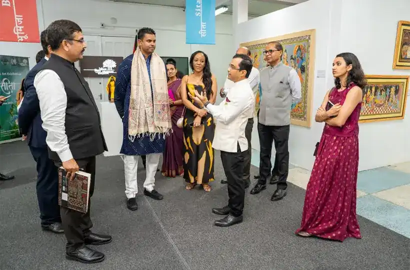While Ramayana and Ramcharitramanas have been primarily thought of as the story of Rama, Sita's geographical and cultural provenance from Bihar creates an immediate anthropological and emotional connection with the migrant community. Sita’s origins in Sitamarhi, Bihar establishes a direct cultural lineage to the diaspora community that transcends temporal and geographical boundaries. Honouring this lineage, the Bihar Museum, Patna (India) gathered folk artists from Bihar to portray Sita's life and journey through their art. Thirty renowned folk artists, including Padma Shri awardees and recipients of national and state awards, specialising in Madhubani, Manjusha, Tikuli, Sujani and Applique, participated in an art camp. These artists, predominantly women, narrated Sita’s story in the folk arts of Bihar. These folk artists captured various moments from Sita's life - her birth, childhood, marriage, abduction and exile - through varied traditional art forms.