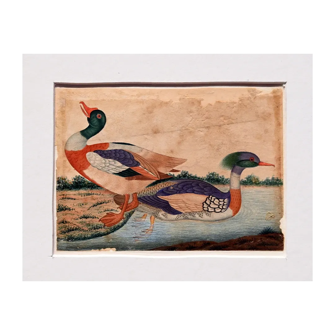 This exquisite painting on paper depicts two vibrant ducks in a serene natural setting. One duck is shown gracefully stepping into the water, while the other, having just finished its bath, dries itself on the ground. Painted in bright, lively colors, the ducks exude movement and vitality. A small patch of land and surrounding plants hint at a lush, tranquil pond setting. The artwork beautifully captures the charm and simplicity of nature, reflecting the artist’s keen attention to detail and deep appreciation for the natural world.