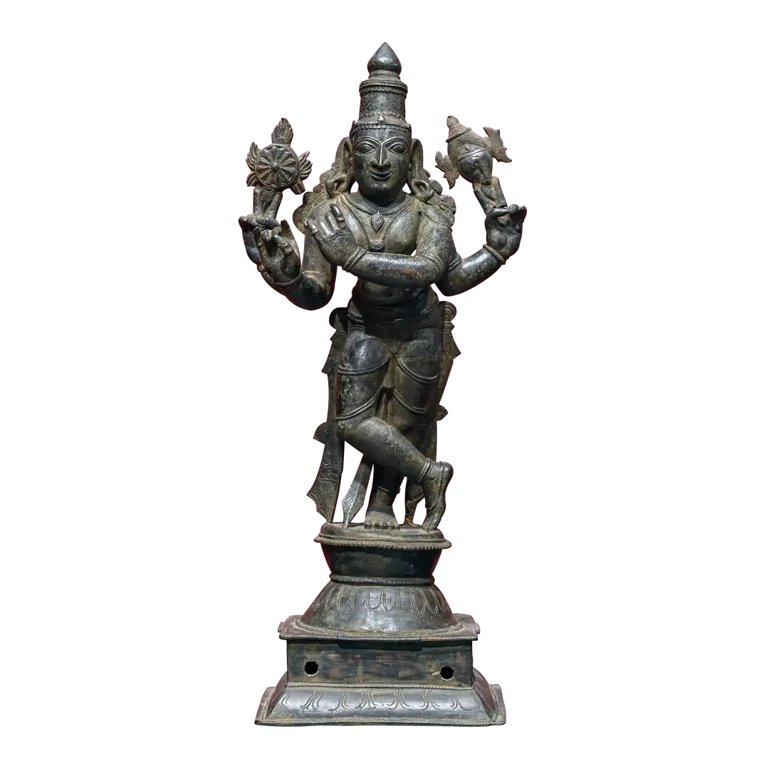 This elegant sculpture depicts Venugopala, a flute-playing form of Lord Krishna, standing in the graceful tribhanga pose on a round lotus base mounted on a square pedestal. Adorned with a tall, ornate crown, the deity is four-armed—a characteristic feature of his divine iconography. His front hands are positioned as though holding a flute, evoking his role as the enchanting cowherd who mesmerized the world with his music. The upper right hand holds a chakra (discus), symbolizing cosmic order and protection, while the upper left bears a shankha (conch), representing auspiciousness and the primordial sound. This representation beautifully blends Krishna's pastoral charm with his divine attributes. Created for ritual and procession, such bronzes were revered not just as art, but as sacred embodiments of divinity in temple and festival worship.